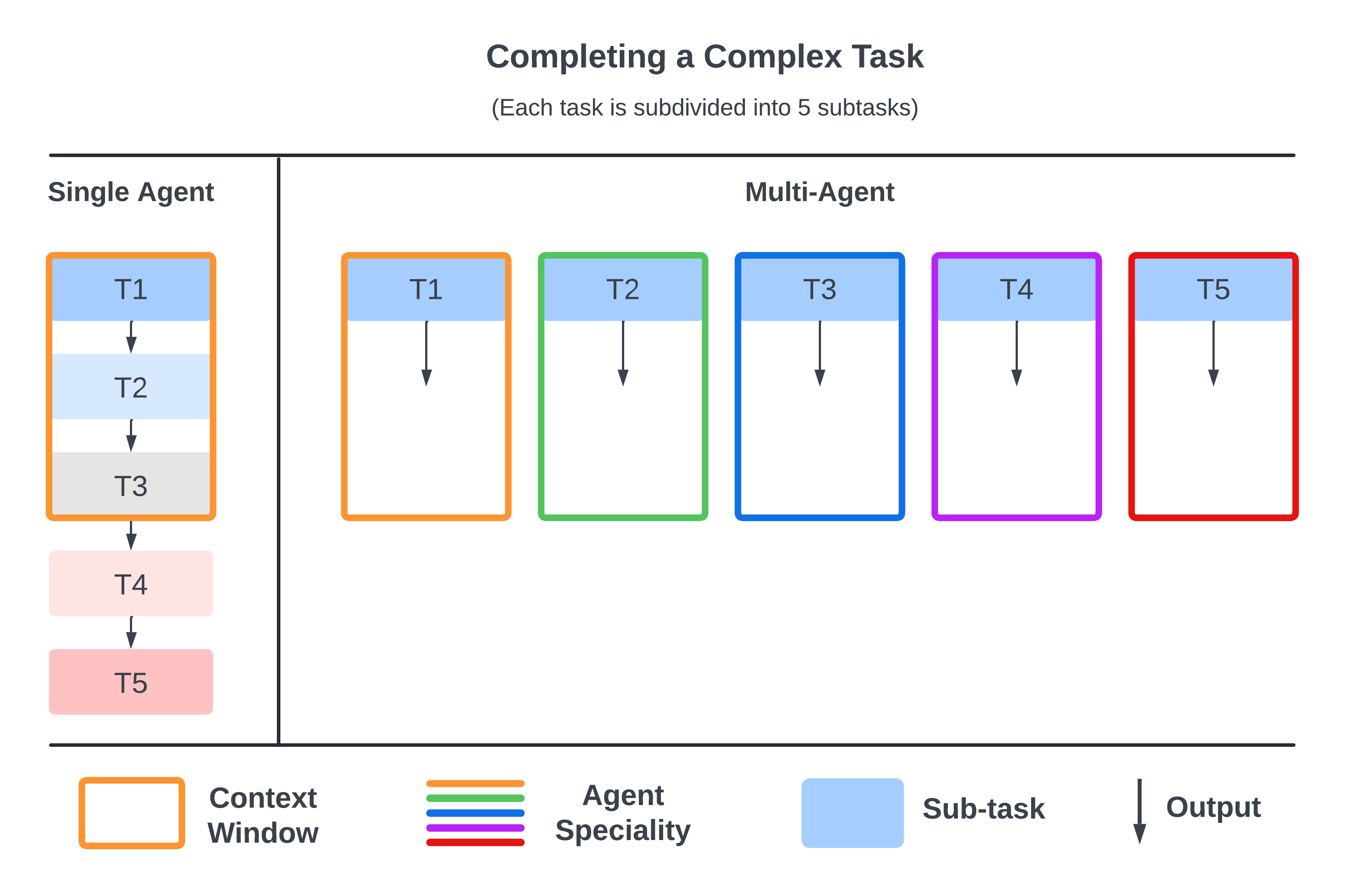 Logically it makes sense but I wanted to rigorously test. The below image simply describes why this might be the case. LLM systems have a certain and unchangeable context window (no. of tokens that can be used for a task). This can have an affect on it the quality of the task execution. In the single agent system, context might be lost - leading to worse task performance.