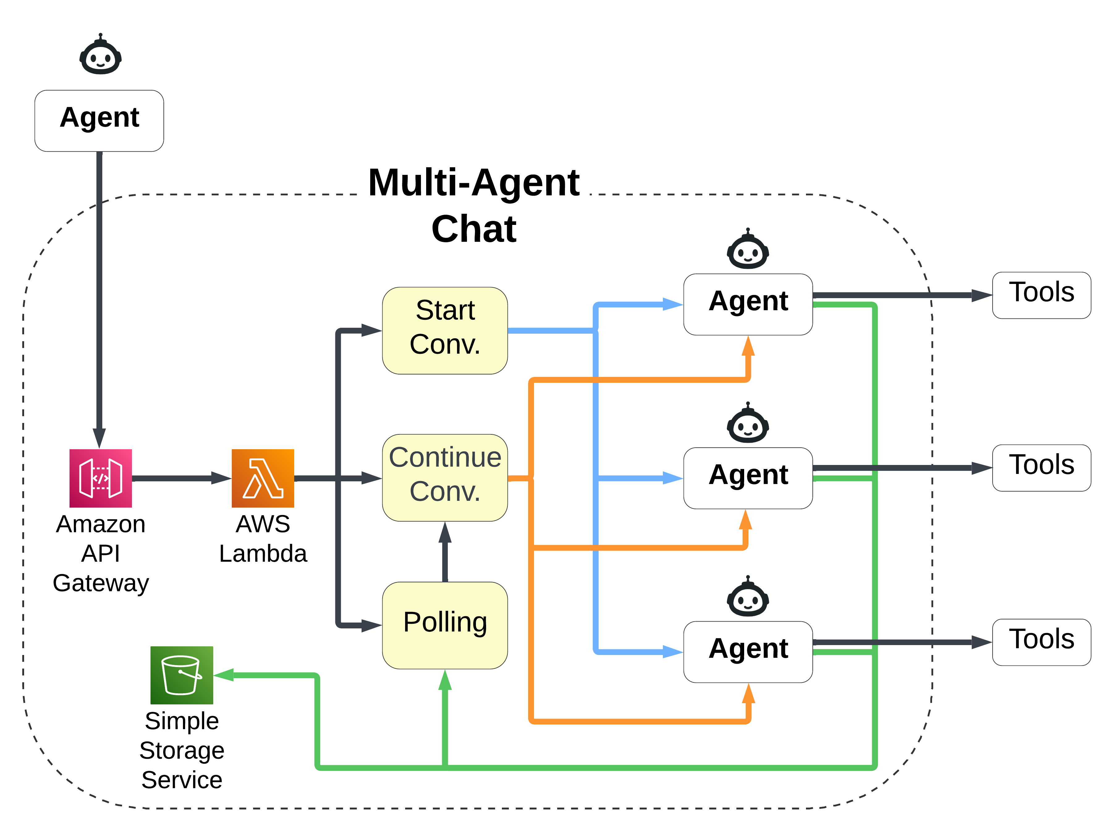Initially, the plan was to use Microsoft's Autogen or CrewAI, but for speed and simplicity I created my own multi-agent chat framework hosted on AWS. The agent can initiate a chat with any number of agents to work on any task of its choosing.