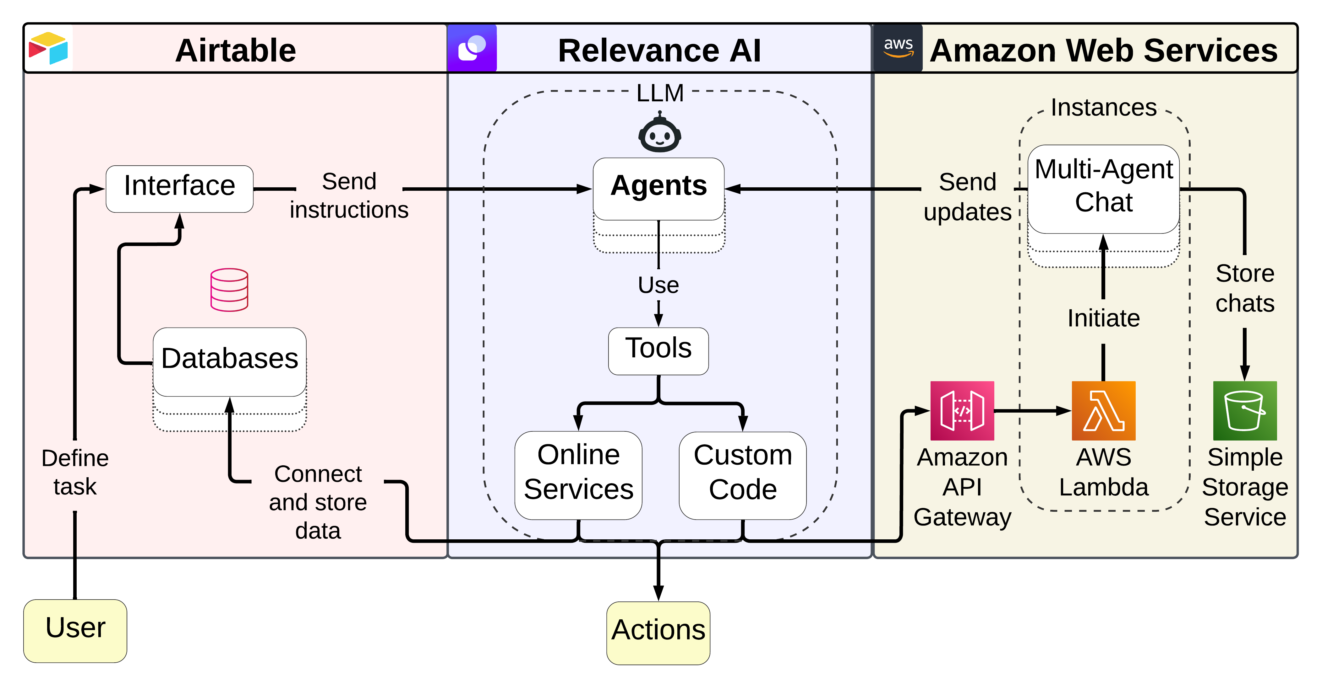 To build the system described I used 3 main softwares. Airtable to host databases and content. Relevance AI to host agents and custom-coded Python tools for the agents. AWS to host the multi-agent interactions between the agents. The general architecture of the system is described below.